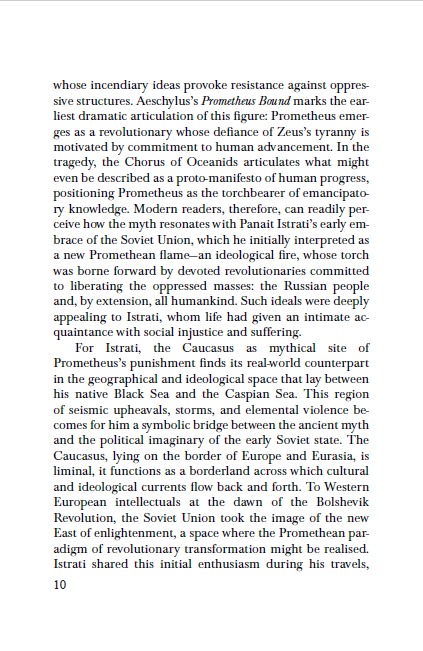 In Istrati’s representation, the Prometheus of the Caucasus emerges as a cautionary figure whose ‘other flame’ illuminates the perils of revolutionary absolutism. His story thus becomes a metaphor for the Soviet Union’s descent into disillusionment: a flame that once seemed to herald human progress but ultimately revealed itself to be a source of suffering for labouring beneath the yoke of the authoritarianism it brought.
